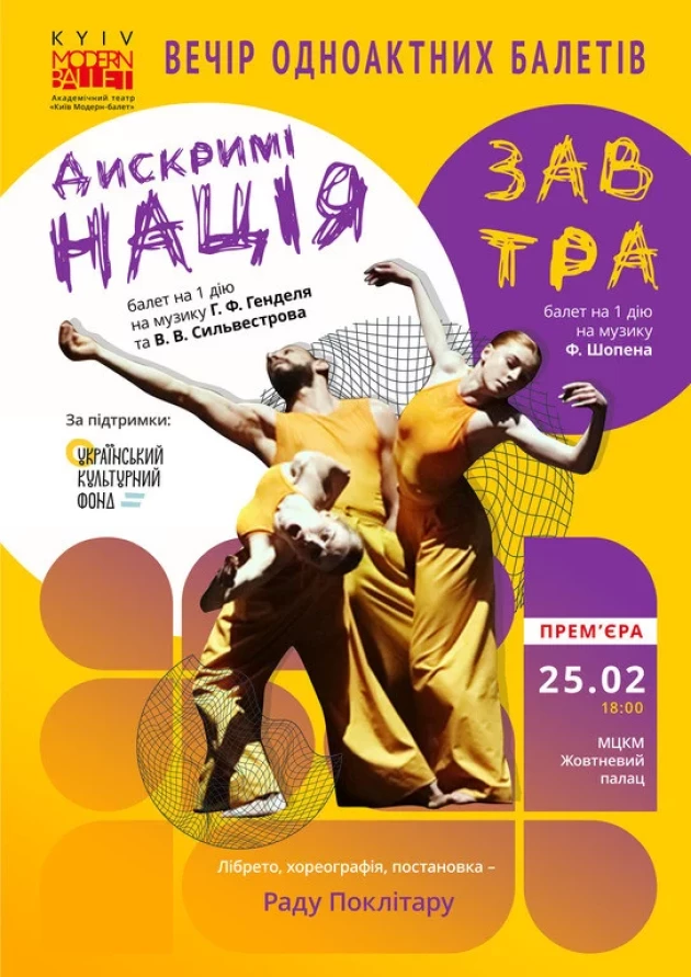 Раду Поклітару та Kyiv Modern Ballet запрошують на вечір одноактних балетів. "ДискриміНАЦІЯ" — вистава на музику Г. Генделя та В. Сильвестрова — поєднує різні історії, які демонструють порушення прав людини, утиски й інші форми дискримінації.