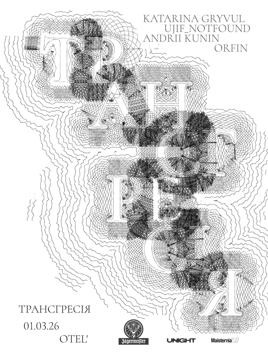 "Трансгресія" — це серія електронно-інструментальних музичних подій, що поєднують живе виконання та експериментальний звук. У межах першої події на сцену вийдуть Katarina Gryvul, Ujif_notfound, Andrii Kunin та orfin — артисти, кожен з яких поєднує електронну музику зі звучанням класичних або DIY інструментів.