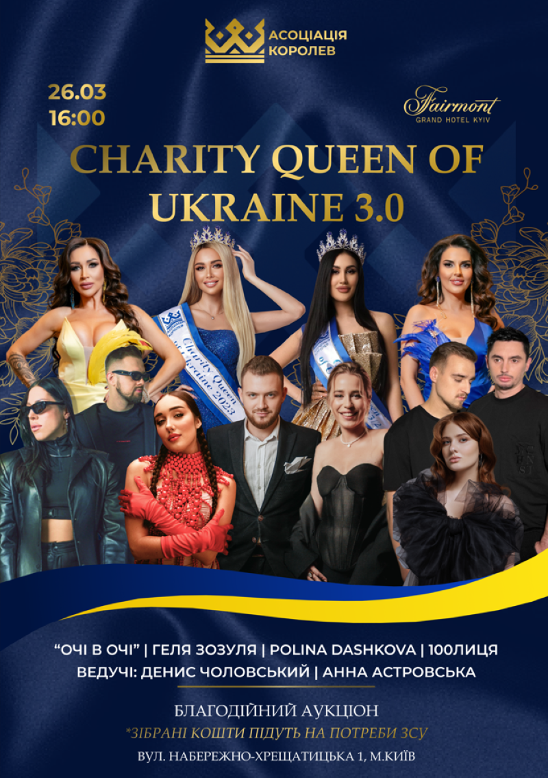 CHARITY QUEEN of UKRAINE 2024 — фінал українського жіночого конкурсу краси, в рамках якого відбудеться благодійний аукціон цінних лотів, що має на меті зібрати кошти в підтримку наших воїнів на передовій. Гала-вечір, у проведенні якого візьмуть участь Королеви краси, громадські діячі та зірки театру, кіно та естради, націлений на об'єднання благодійних зусиль. В ціну квитка входять прохід по червоному хіднику, місце за столиком в банкетній залі, welcome drink та пригощання від закладу.