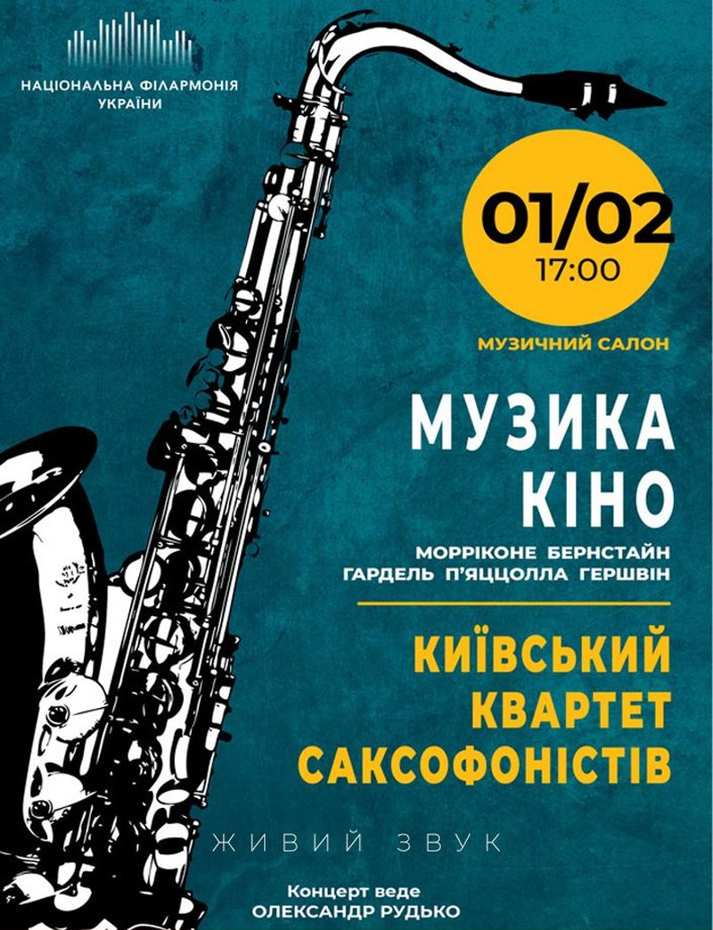Київський квартет саксофоністів зіграє музику з відомих фільмів та занурить глядачів в атмосферу тих стрічок, де вони звучали. Прозвучить музика з "Одного разу в Америці", "За жменю доларів", "Вестсайдська історія", "Місія" тощо. Концерт відбудеться у музичному салоні філармонії, тож вечір буде камерним та затишним.