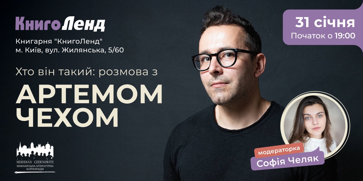 У книгарні "КнигоЛенд" пройде зустріч з українським письменником Артемом Чехом, автором понад десяти книжок, серед яких "Точка нуль", "Хто ти такий?", "Район Д", "Пісня відкритого шляху". На гостей чекає дружня дискусія про літературу, читання, стосунки між людьми в умовах війни та поза нею. Артем Чех поділиться думками про межу між життям і творчістю, а також розповість більше про себе та свої книги.