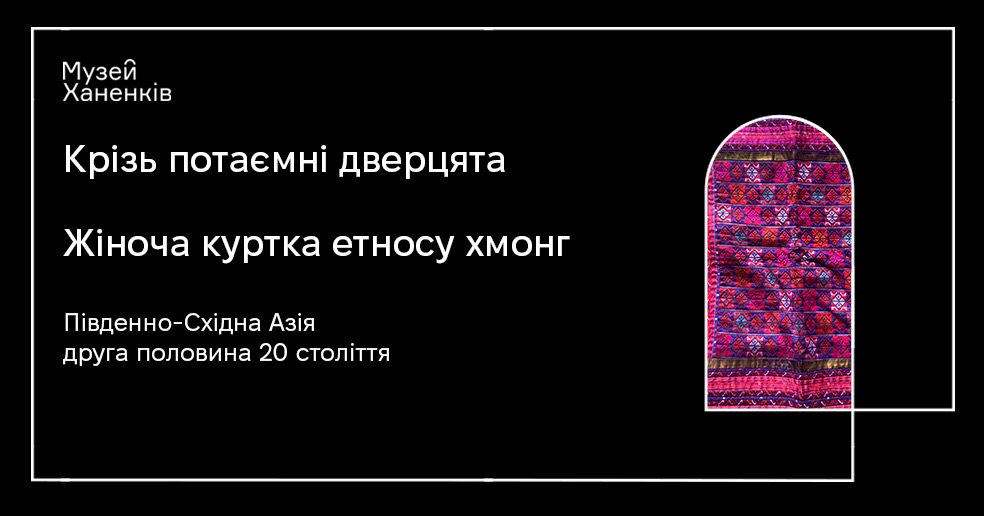 Музей Ханенків продовжує проєкт "Крізь потаємні дверцята", в межах якого демонструють окремі твори з власної колекції та проводять кураторські екскурсії. Першим експонатом цього року стане жіноча куртка хмонгів — загадкового народу родом із тропічних лісів та гірських регіонів Східної Азії.