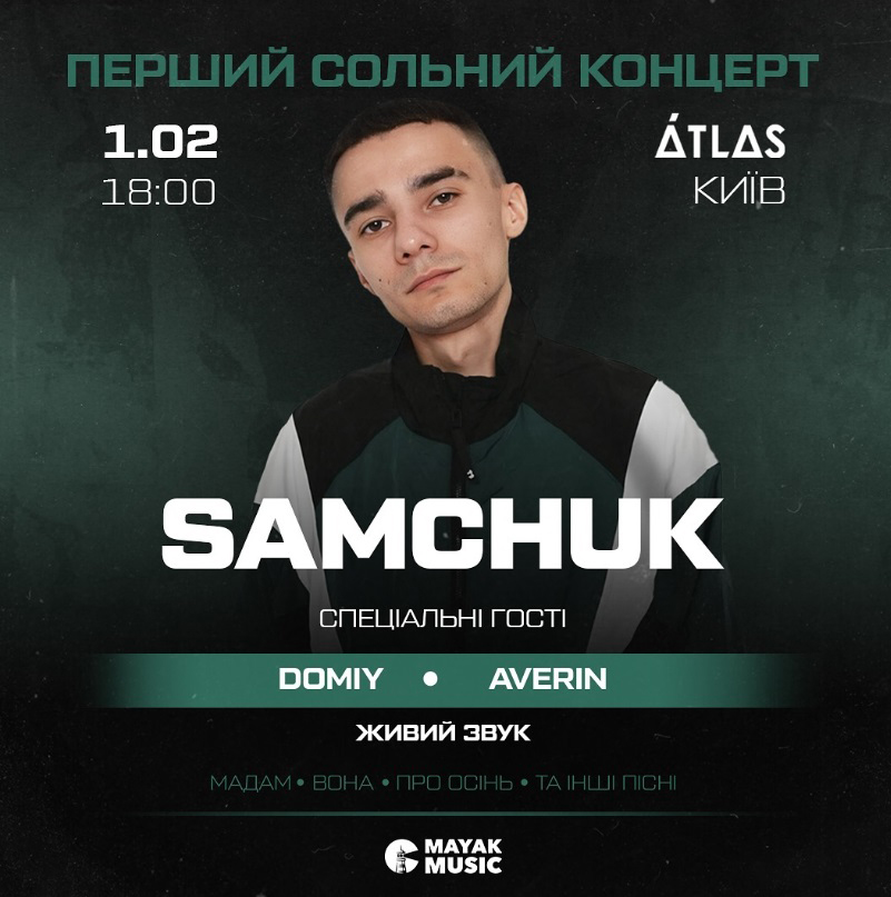 Сучасний романтик SAMCHUK (Андрій Самчук) — автор та виконавець пісень, які хочеться надіслати коханню всього життя зі словами: "Це ми!". На концерті лунатимуть такі хіти, як "Мадам", "Вона", "Про осінь", "Сумна романтика", а також дуетні композиції з Domiy і Averin.