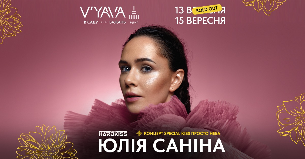 Юлія Саніна виступить зі своєю спеціальною програмою Special Kiss у культурному просторі V'YAVA, де просто неба прозвучать головні хіти The HARDKISS у сольному виконанні співачки.