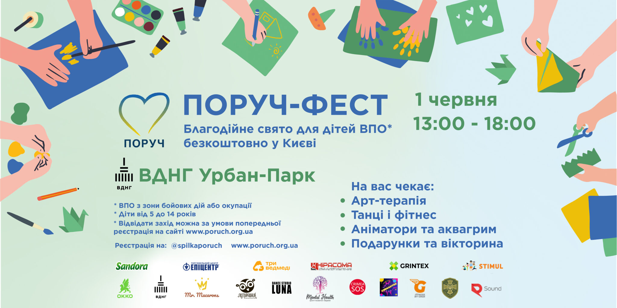 Дітей-переселенців та їхніх батьків зі сходу й півдня України запрошують взяти участь у благодійному "ПОРУЧ-ФЕСТі". На малечу чекають ігри з аніматорами, заняття з арттерапевтами, творчі майстер-класи, спортивні розваги й солодощі. Для батьків організатори теж підготували цікаві воркшопи та активності.