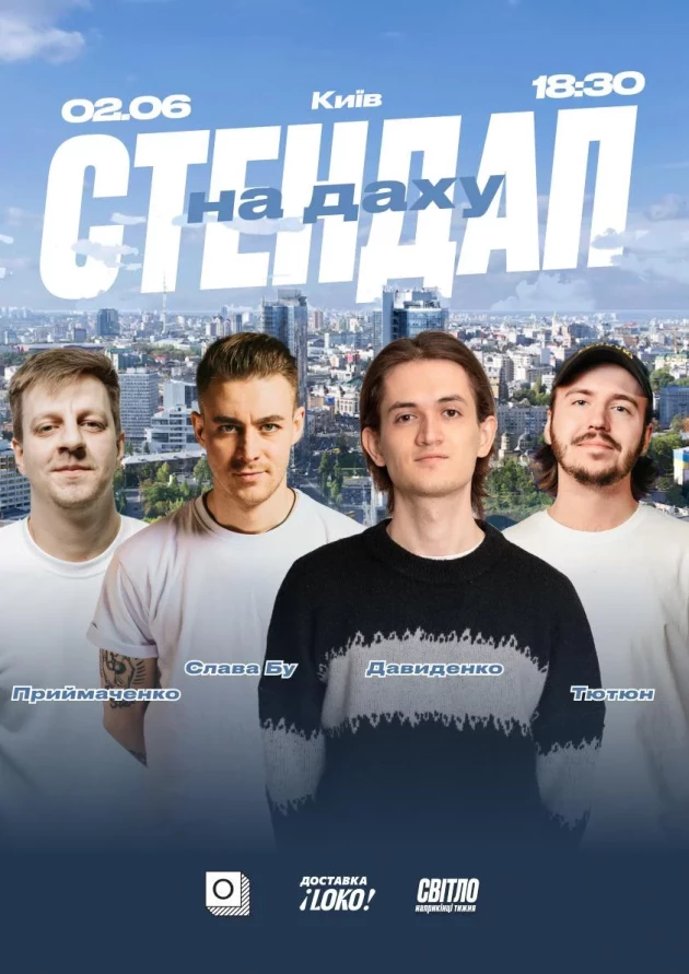 У самому серці міста, на красивому даху, з якого відкриваються чудові краєвиди на центр Києва, тебе порадують новим жартами Дмитро Тютюн, Олексій Приймаченко, Слава Бу та Макс Давиденко. Врахуй, що жарти будуть 18+.