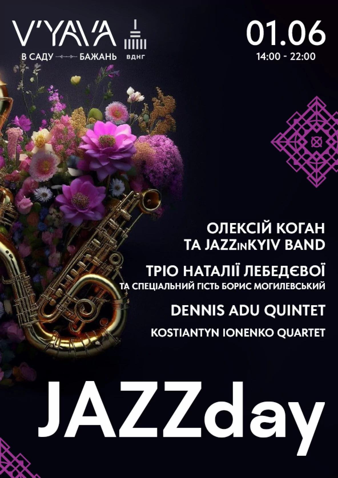 Цього дня на V'YAVA в Саду Бажань дадуть джазу Олексій Коган та Jazz in Kyiv Band, Тріо Наталії Лебедєвої та спеціальний гість Борис Могилевський, Dennis Adu Quintet і басист, композитор Костянтин Іоненко, які гратимуть прогресивну сучасну авторську джазову музику. Кажуть, буде магічно!