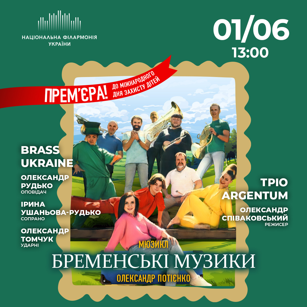 Мюзикл "Бременські музики" — це виразні мелодії, яскраве звучання квінтету Brass Ukraine та цікаве режисерське рішення, що нагадує мандрівний театр. Разом із музикою Олександра Потієнка диво на сцені забезпечать актори з тріо Argentum, які додадуть дійству легкості та жвавості. Мюзикл буде цікавий для перегляду усією сім'єю.