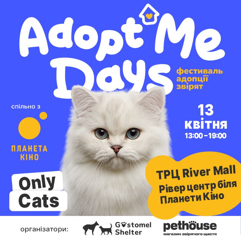 Пухнасті, плямисті, грайливі та сонні, маленькі та великі — усі ці котики 13 квітня чекатимуть своїх петбатьків на фестивалі адопції звірят AdoptMe Days. Новий формат AdoptMe Days | Only Cats збере на території десяток притулків з вакцинованими, чипованими та обробленими тваринками, яких безплатно віддаватимуть у родини.