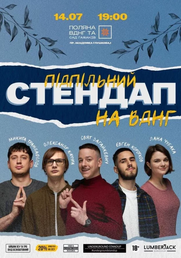 Цього вечора на сцені будуть амбасадори зухвалих стендапів: Свят Загайкевич, Олександр Качура, Лана Чубаха, Микита Трандафілов, Женя Коротков.