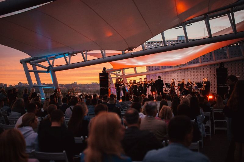 Концерт відбудеться на просторій терасі з краєвидом на вечірні схили Дніпра — ідеальне місце, щоб зустріти захід сонця.