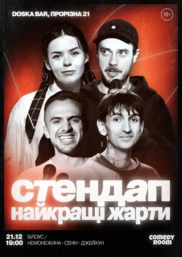 Цієї суботи ти почуєш лише найкращі жарти та круту імпровізацію від досвідчених коміків — Антона Сеніна, Світлани Немонежиної та Джейхуна Сафарова.