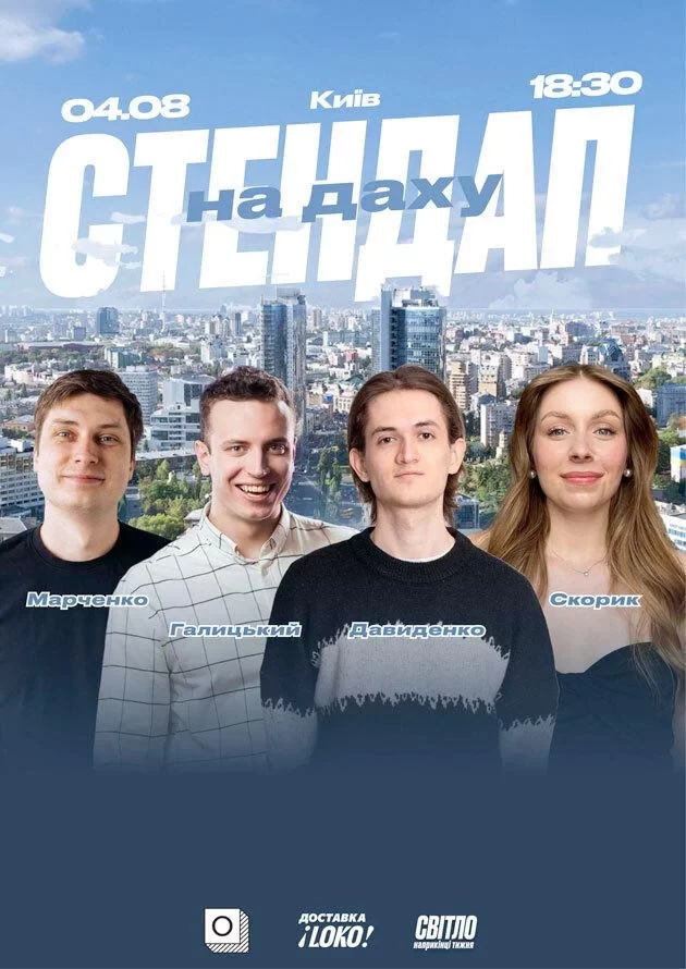 Ця програма 18+ подарує тобі нові жарти від улюблених коміків: Наталі Скорик, Свята Марченка, Влада Галицького та Максима Давиденка. А слухатимеш ти їх у самому серці міста — на даху, з якого відкривається шаленої краси краєвид на центр Києва!