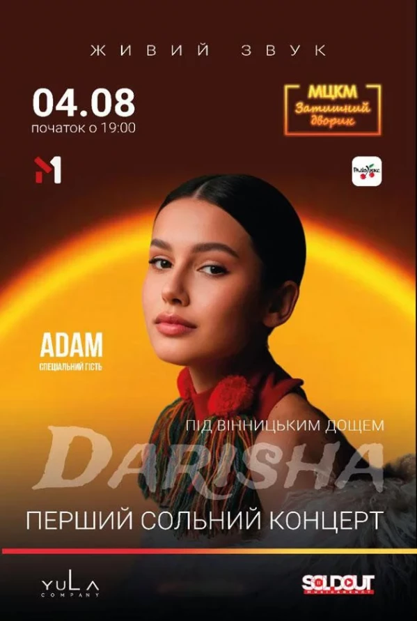 Darisha, виконавиця хіта "Під вінницьким дощем", що зібрав понад п'ять тисяч публікацій військових у ТікТок, дає перший сольний концерт просто неба. Співачка виконає близько двадцяти пісень, серед яких дуети, прем'єри, неочікувані перформанси в супроводі мультиінструментального бенду, а також нові пісні, написані в колаборації з фронтменом гурту ADAM Михайлом Клименком (він стане спеціальним гостем концерту). До того ж у день виступу Darisha презентує ЕР-альбом.