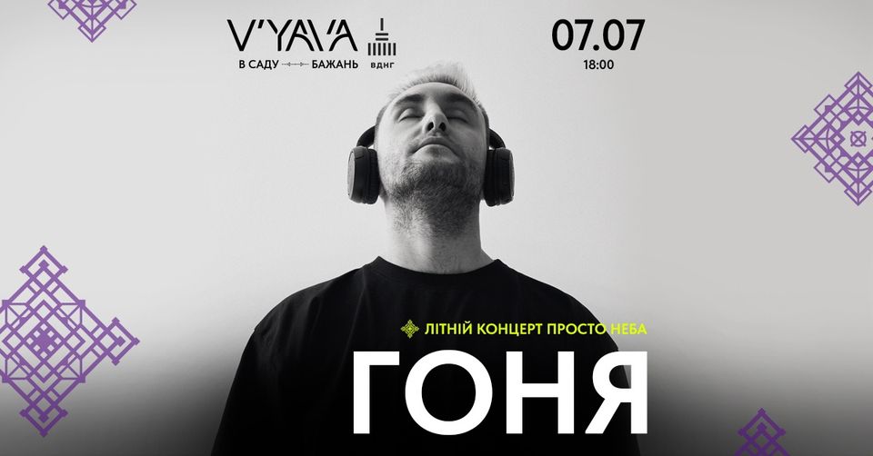 Репер Гоня з літнім концертом просто неба — на V'YAVA! Експредставник гурту "Глава 94", номінант низки музичних премій і учасник багатьох музичних фестивалів за понад 15 років зібрав свою вірну аудиторію. Цього вечора для неї прозвучать "Сад", "Як?", "Інферно" та інші хітові треки в його виконанні.