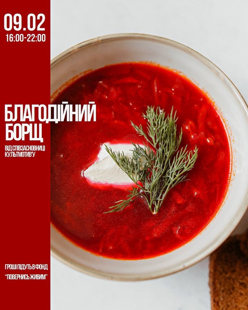 У просторі "КультМотив" подаватимуть благодійний домашній борщ від співзасновниці Світлани Павліченко. А ще будуть сало, домашні соління та чимало іншого під самогонку. Все це — заради збору коштів для допомоги нашим воїнам: зібрані гроші підуть у фонд "Повернись живим".