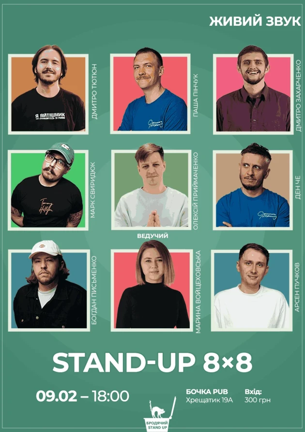 Цього вечора виступатимуть 8 талановитих коміків, і кожен із них має лише 8 хвилин, щоб розсмішити тебе до сліз! Це буде вечір свіжих ідей, несподіваних поворотів і вибухових моментів. Не пропусти шанс стати частиною цього унікального стендап-шоу — свята коротких, але яскравих виступів, де кожен комік покаже свій максимум.