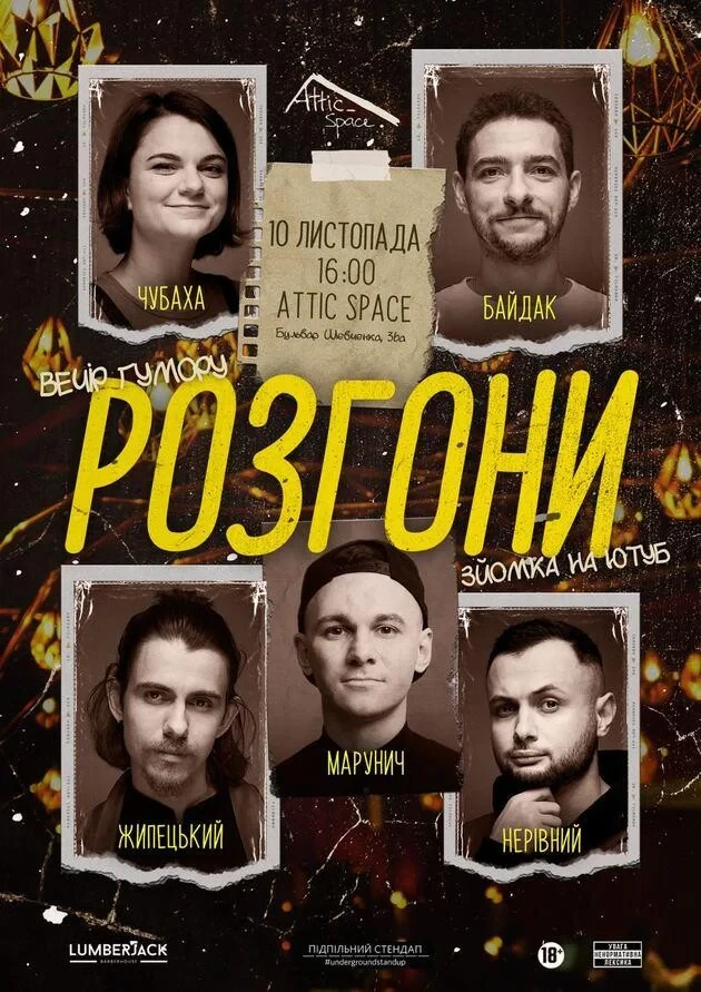 Цього вечора розганятимуть: зірка стендапу Василь Байдак, учасник імпровізаційного шоу Rockstar improv Олександр Жипецький, музична комікеса Лана Чубаха, Ігор Нерівний та фронтмен гурту KARTA SVITU Іван Марунич.