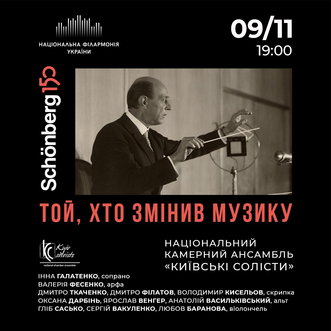 Національний камерний ансамбль "Київські солісти" відзначає 150-ту річницю від дня народження Арнольда Шенберґа концертом "Той, хто змінив музику". Видатний австрійський композитор Шенберґ свого часу перевернув уявлення про класичну музику, а його відкриття у сфері організації звуків остаточно змінили звучання класичної музики, розділивши історію музичного мистецтва на "до" та "після".