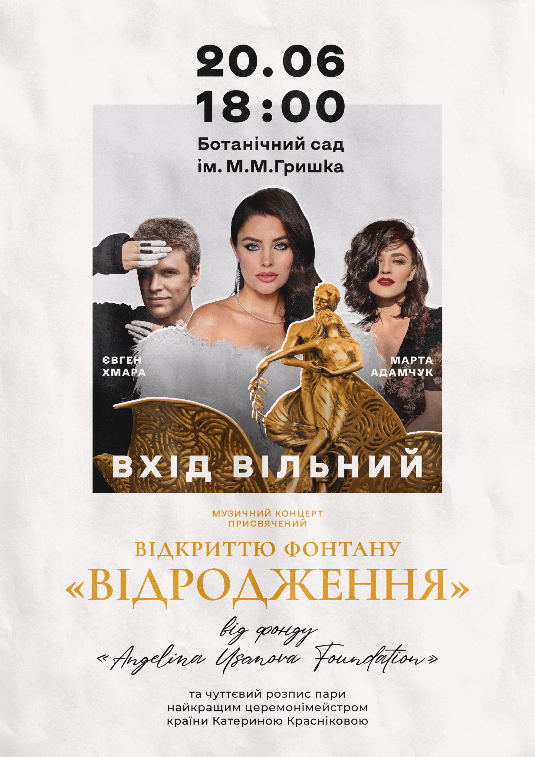 Киян і гостей столиці запрошують на неймовірний концерт у ботанічному саду ім. М. М. Гришка, присвячений урочистому відкриттю фонтану Ангеліни Усанової "Відродження".