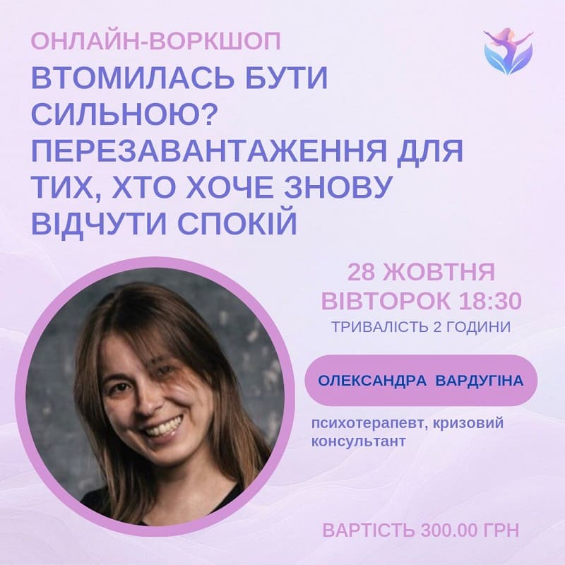 На подію запрошують усіх, хто втомився "тягнути все на собі", хоче встановити особисті межі без провини та повернути внутрішній спокій. Воркшоп вестиме психотерапевтка та кризова консультантка Олександра Вардугіна.