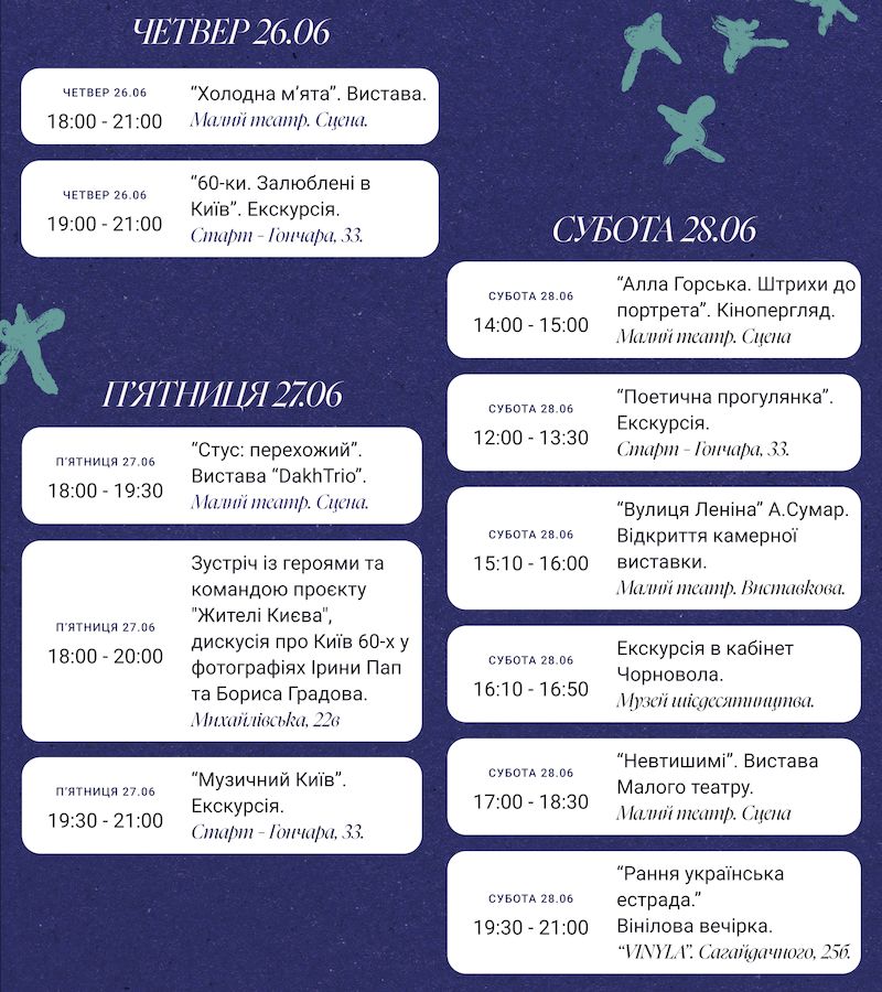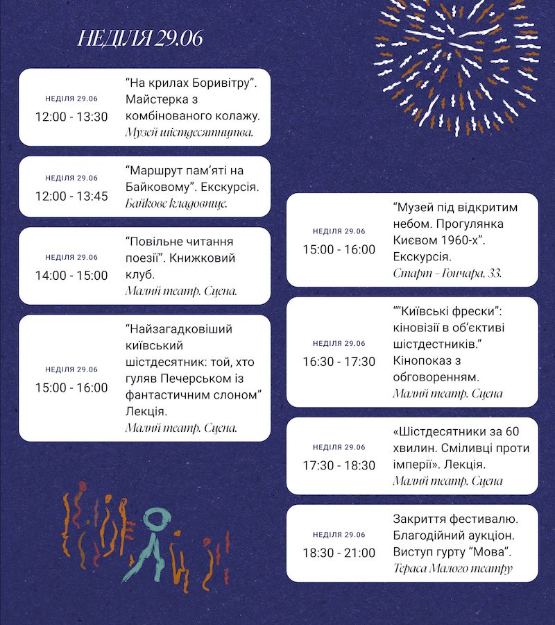 Цьогоріч програма фестивалю розширюється: на гостей чекатимуть лекції, виставка візуального мистецтва, читання прози та поезії шістдесятників, музичні виступи, екскурсії та театральні вистави. Крім того, відбудеться ярмарок локальних брендів і благодійний аукціон.