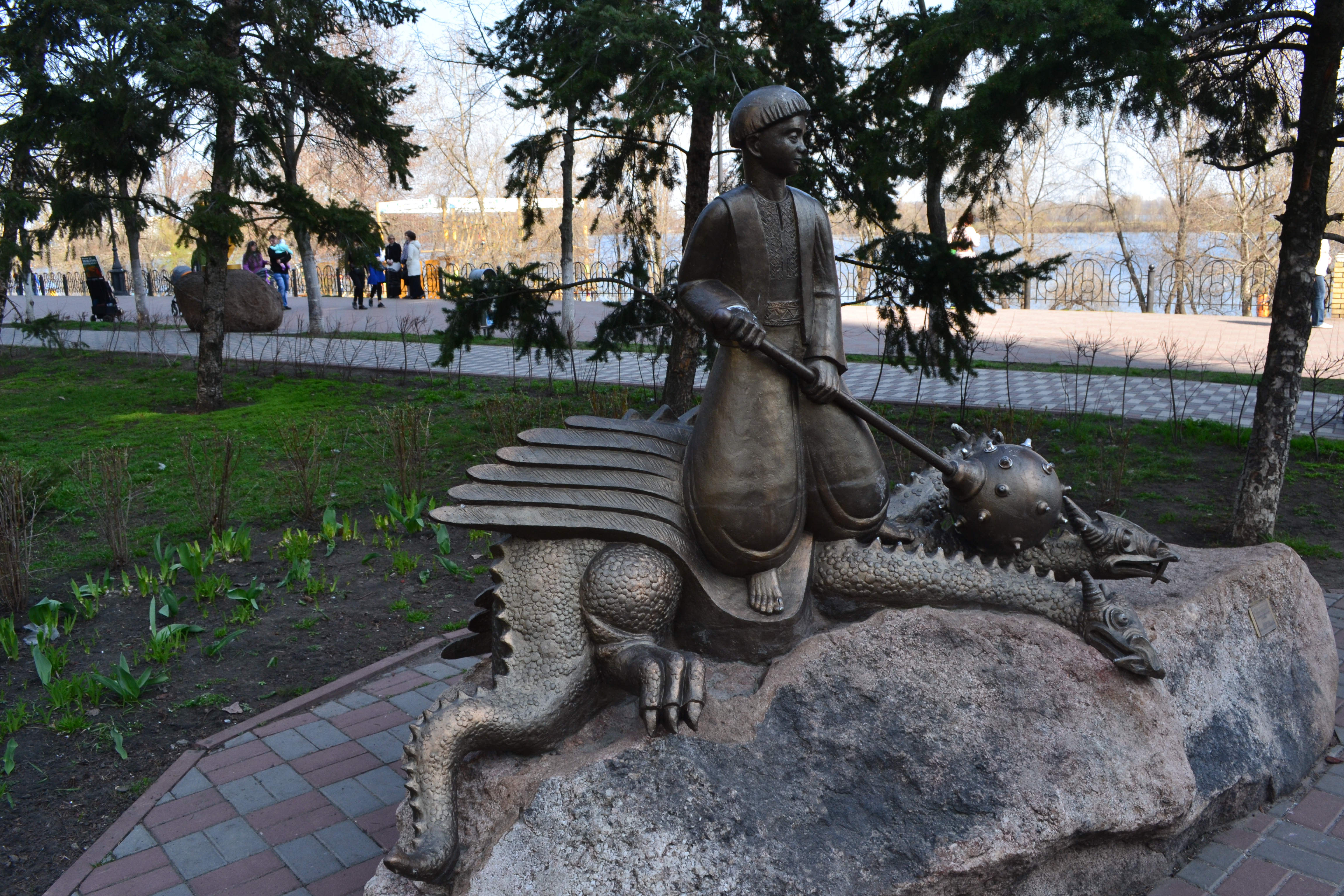 Судячи з усього, кияни дуже поважають легендарного Котигорошка — хлопчика надзвичайної сили, бо в столиці йому присвячено одразу дві скульптури. Перша знаходиться на Оболонській набережній. Її автор — скульптор з Ужгорода Олексій Шамшура. Свого Котигорошка майстер вирішив не наділяти ефектними м'язами, проте вклав йому до рук вражаючих розмірів булаву, якою той вправно розправляється з триголовим драконом.
