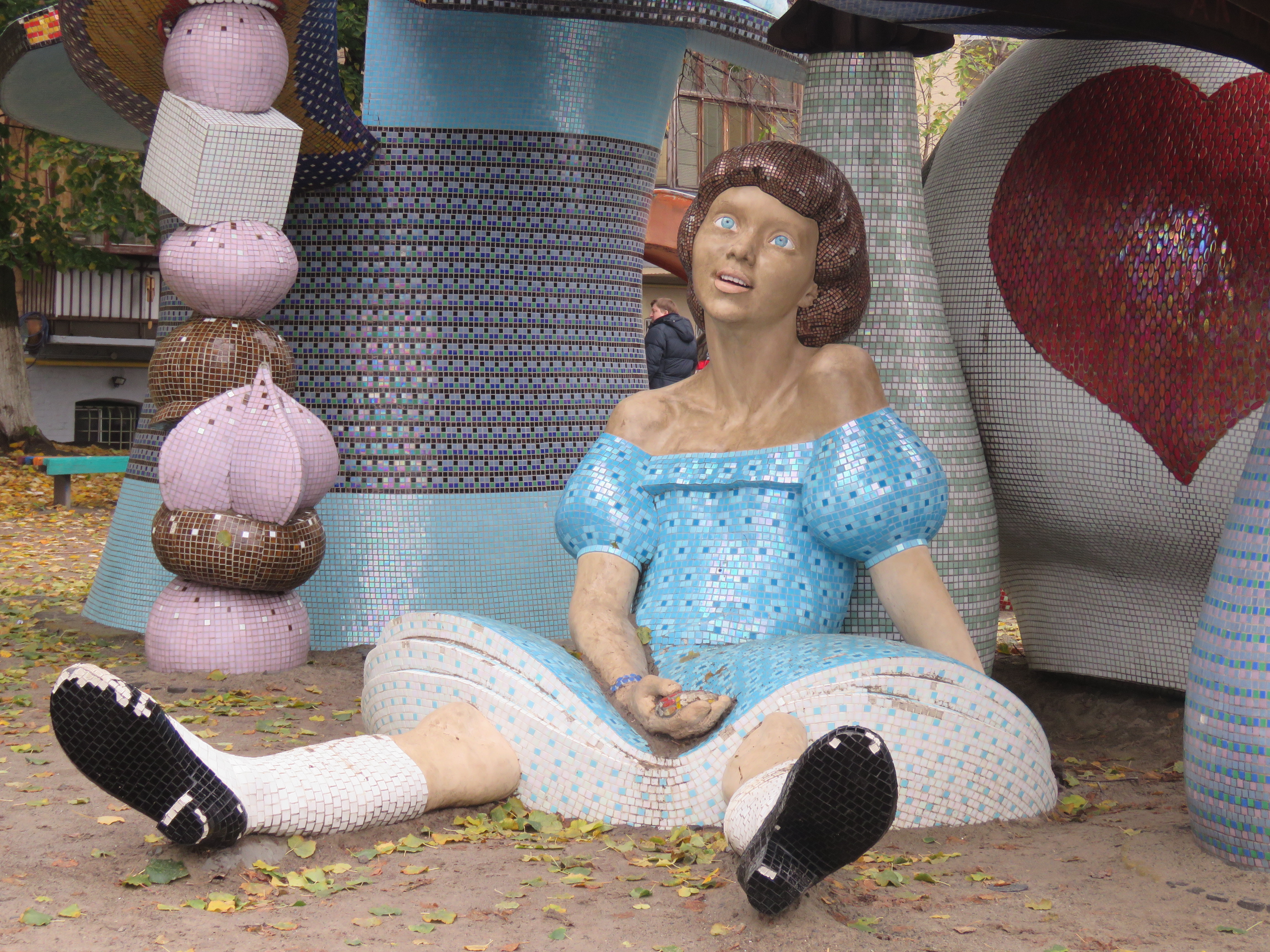 Героїня письменника Льюїса Керрола Аліса (та сама, яка намагалася наздогнати Білого Кролика з годинником) прописана на Пейзажній алеї з 2016 року. На жаль, "Пейзажка" зараз сильно занедбана — 95% робіт скульптора Костянтина Скритуцького, які тут встановлені, потребують негайної реставрації. Проте Аліса на загальному фоні виглядає прийнятно. Як то кажуть, потомлена, але незламна. Нагадаємо, що на створення Аліси у художника пішло три роки й дві тонни бетону, кераміки, мозаїки та металу.