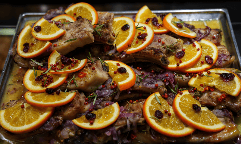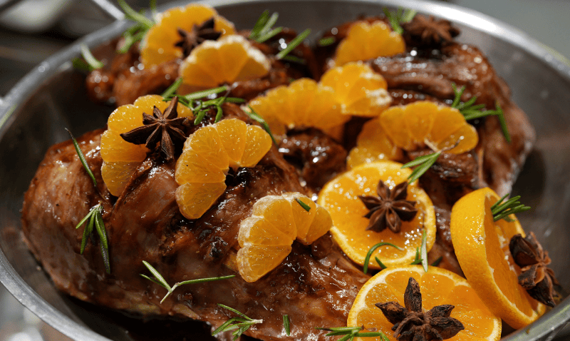 Качина ніжка в апельсиновому маринаді — соковите, ніжне м'ясо, що розпадається на волокна й просто тане в роті. Ніжка маринується в апельсиновому соку з медом, соєвим соусом, імбиром і гірчицею в зернах — це робить кожен шматочок насиченим і ароматним.