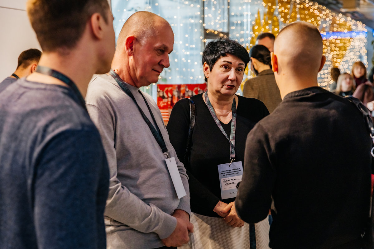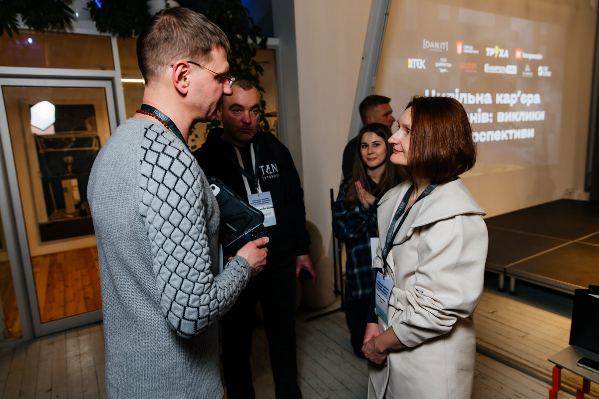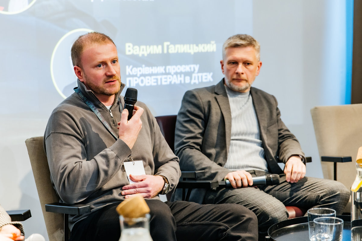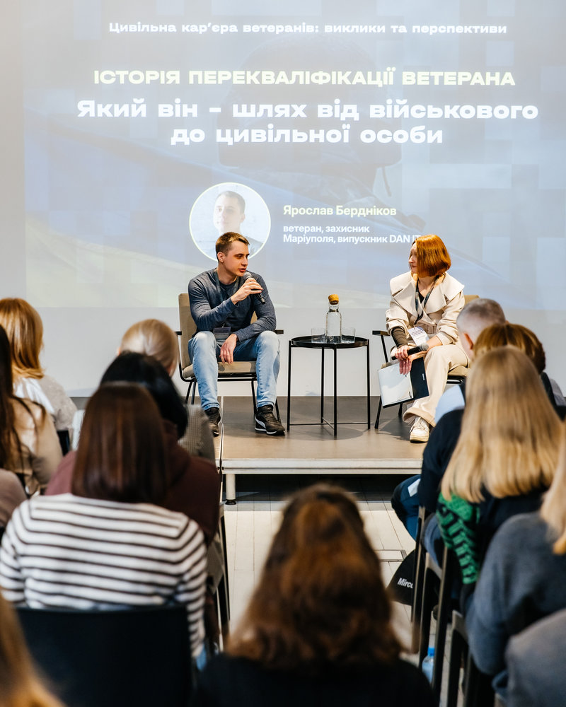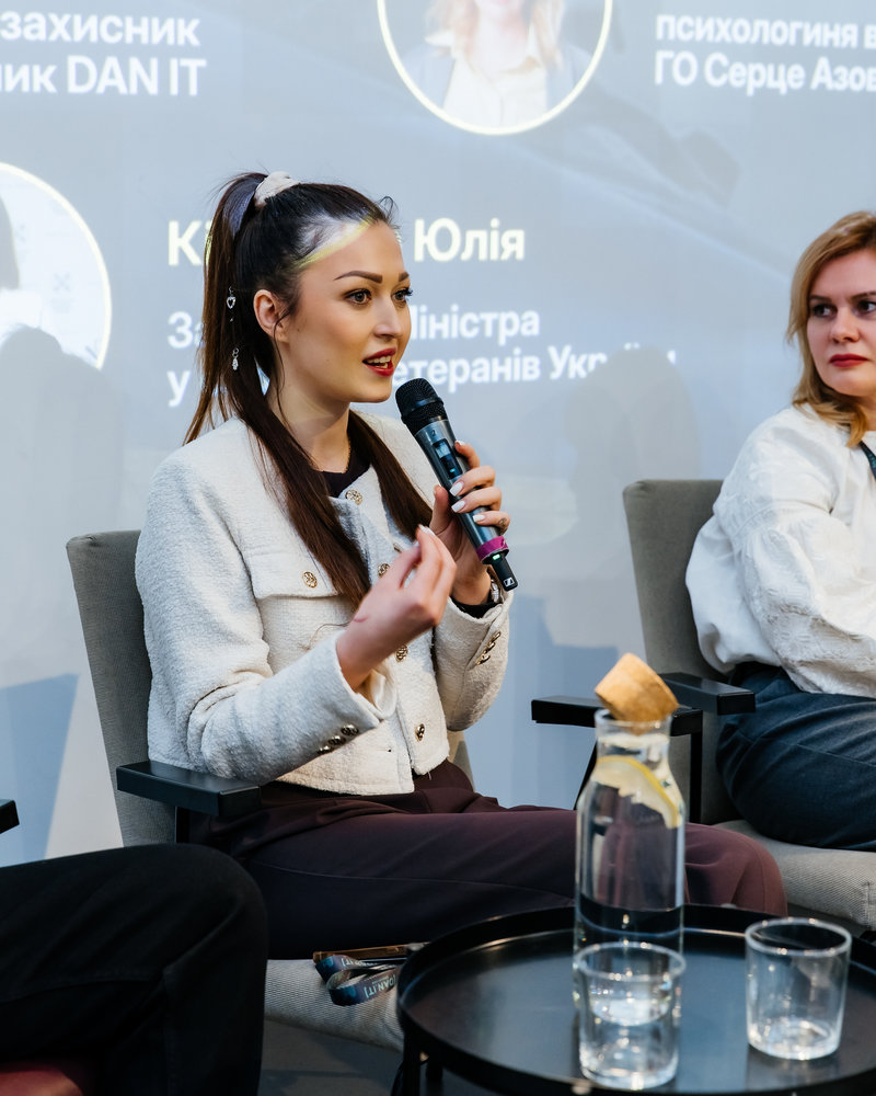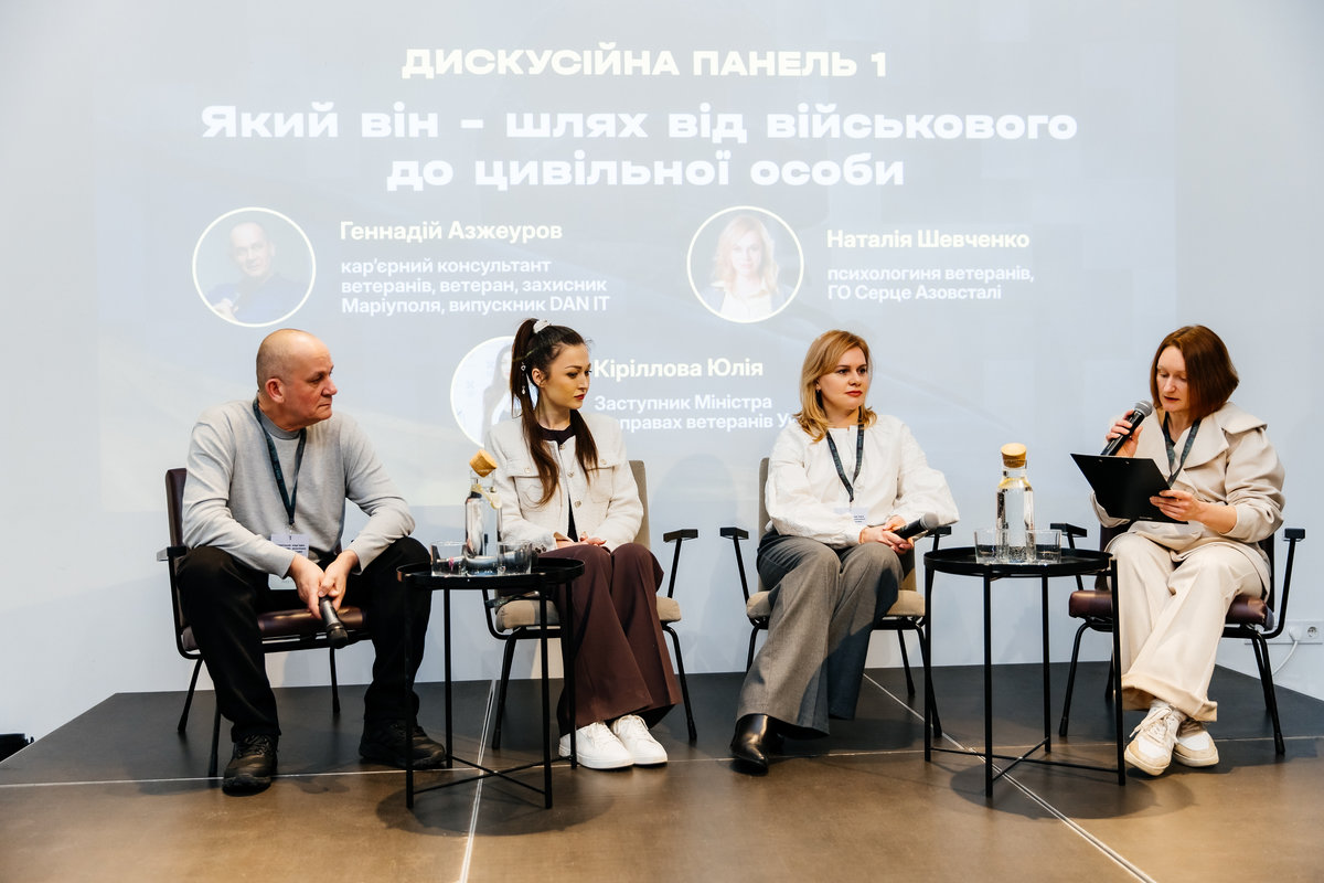 У межах першої дискусійної панелі виступили Геннадій Азжеуров — ветеран, захисник Маріуполя та кар'єрний консультант, Наталія Шевченко — психологиня ГО "Серце Азовсталі", а також Юлія Кіріллова — заступник міністра у справах ветеранів України. Окремо прозвучала особиста історія перекваліфікації ветерана Ярослава Берднікова — випускника DAN.IT.