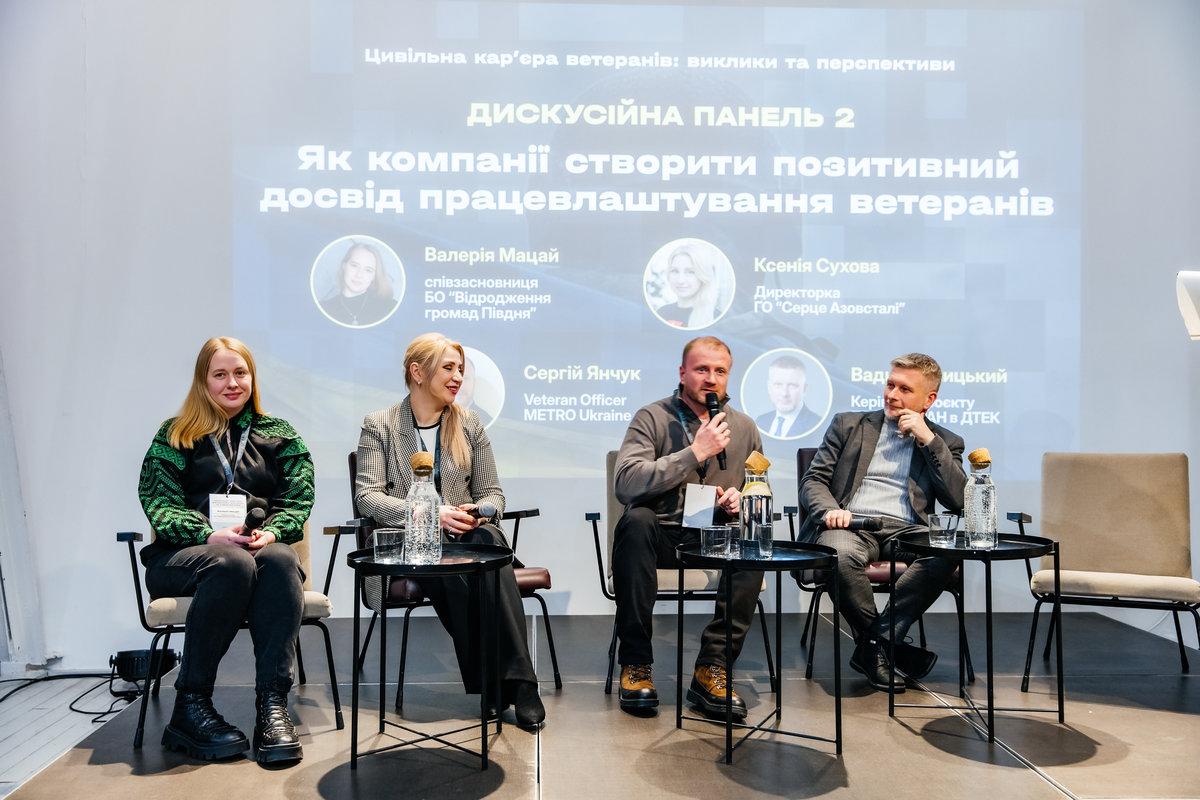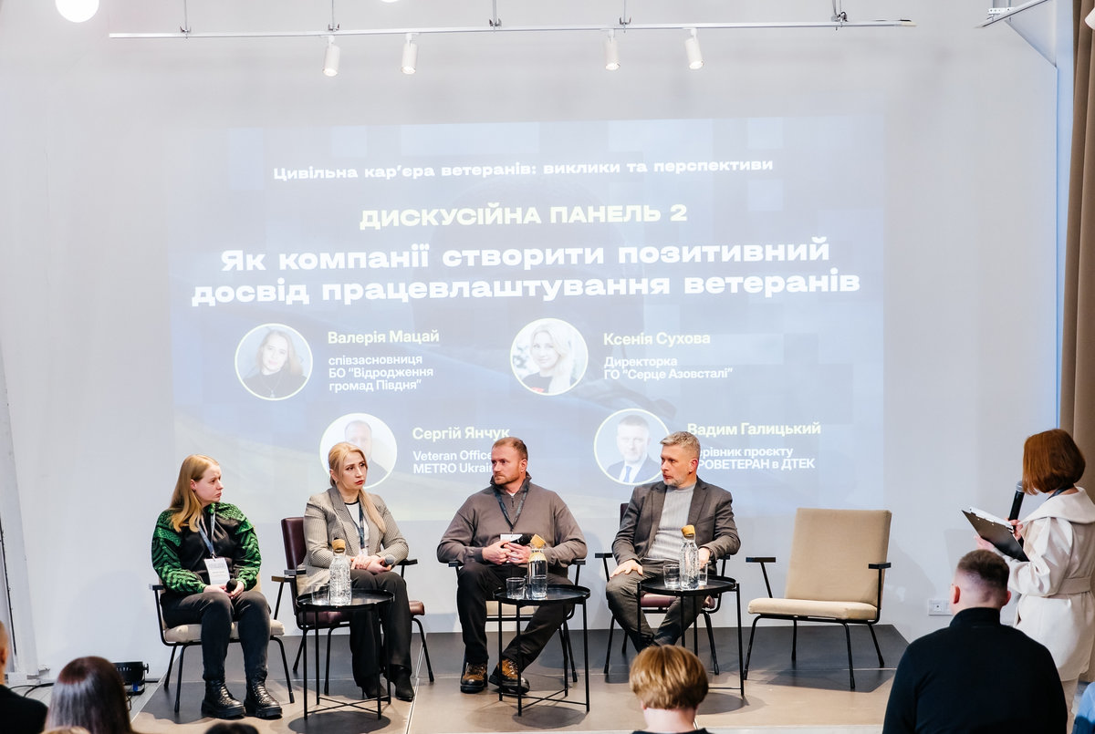У другій панелі взяли участь Валерія Мацай, Ксенія Сухова, Сергій Янчук (METRO Ukraine) та Вадим Галицький — керівник проєкту "ПроВетеран" в ДТЕК.