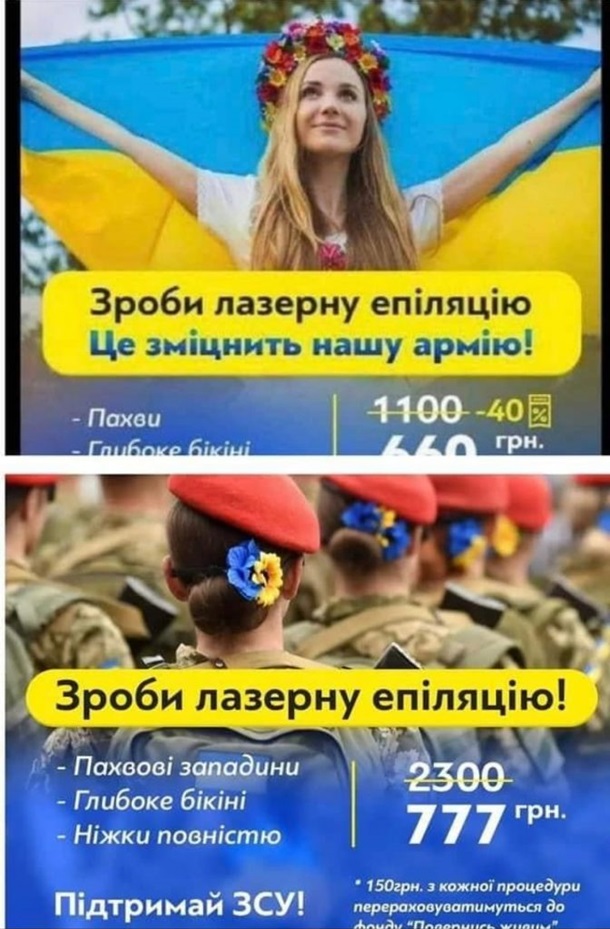 Недоречний патріотизм зачепив і сферу краси. Салони, що надають послуги лазерної епіляції, для реклами почали використовувати світлини з українським прапором, а також із нашими військовими.