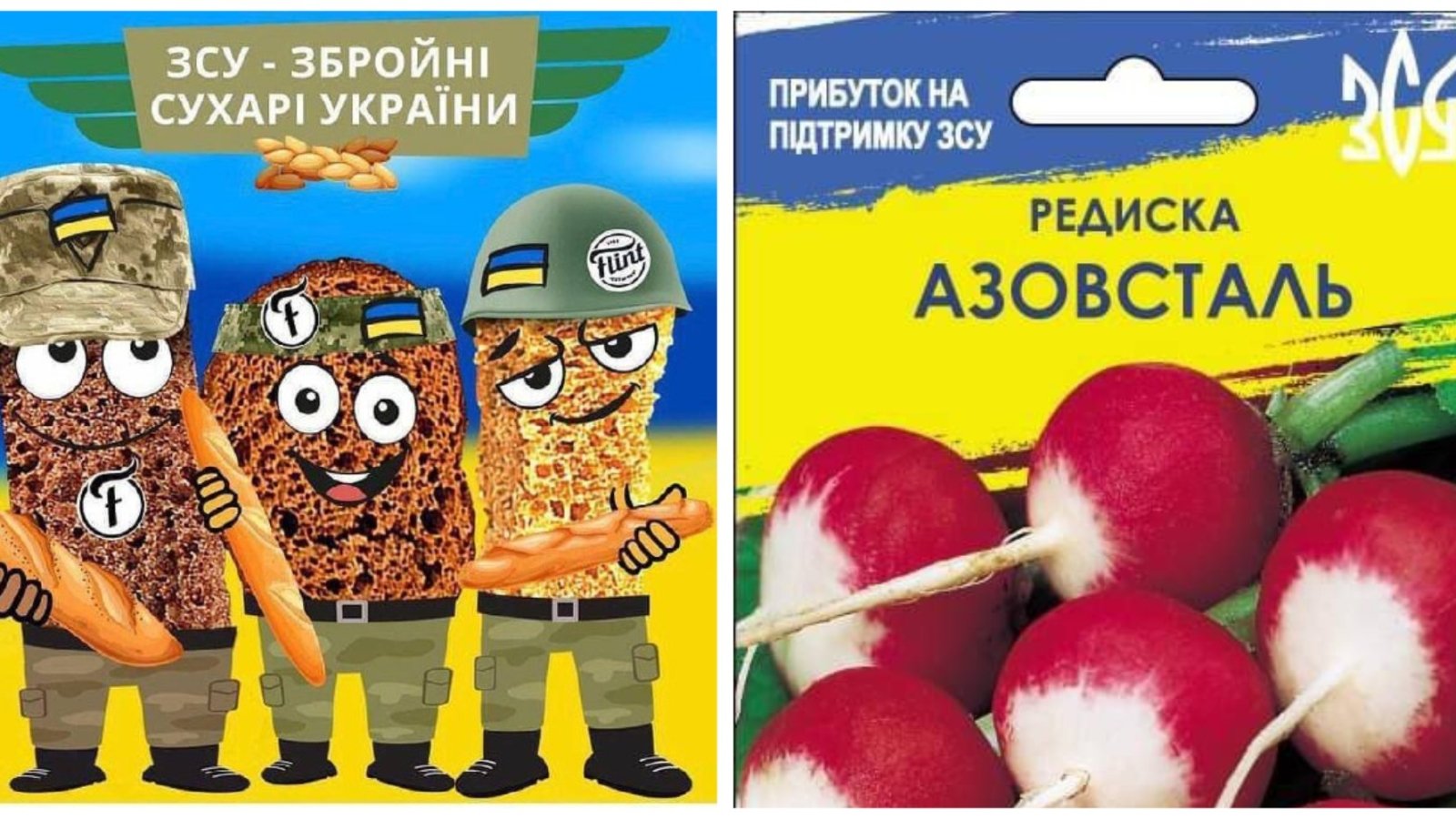 "Патріотичними" стали і продукти на полицях магазинів. Зараз можна придбати "ЗСУ: Збройні Сухарі України", насіння редиски "Азовсталь", насіння кабачка "Привид Києва" чи лаваш із зображенням українських військових. Проте деякі компанії в такий спосіб збирають гроші для допомоги нашій армії: наприклад, виробник насіння з патріотичними назвами обіцяє передати на допомогу ЗСУ всі гроші, отримані з цієї партії товару.