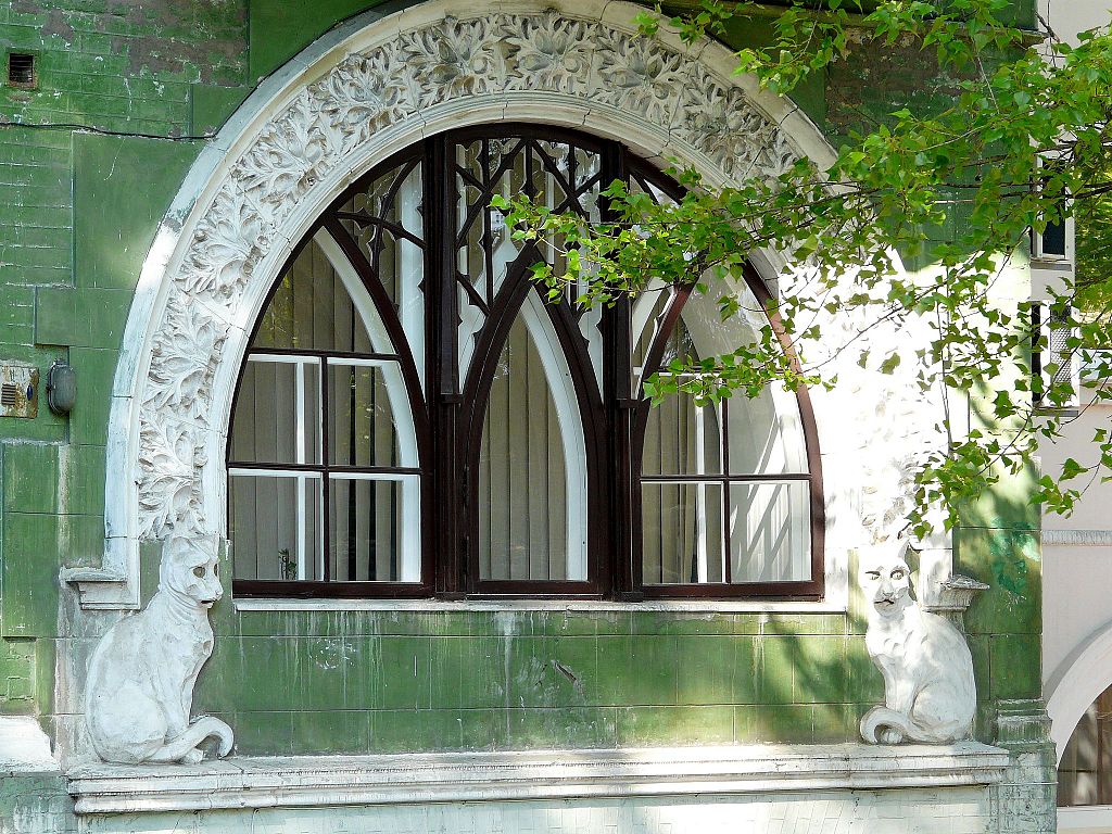 ...а краї великого напівкруглого вікна на першому поверсі — барельєфи котів із зеленими очима та червоними ротами, від яких і походить народна назва пам'ятки.