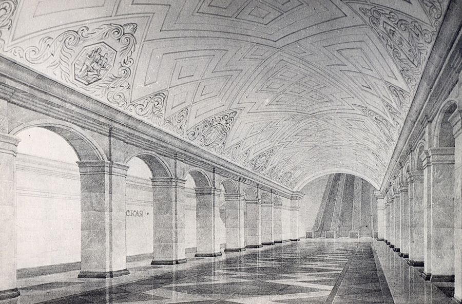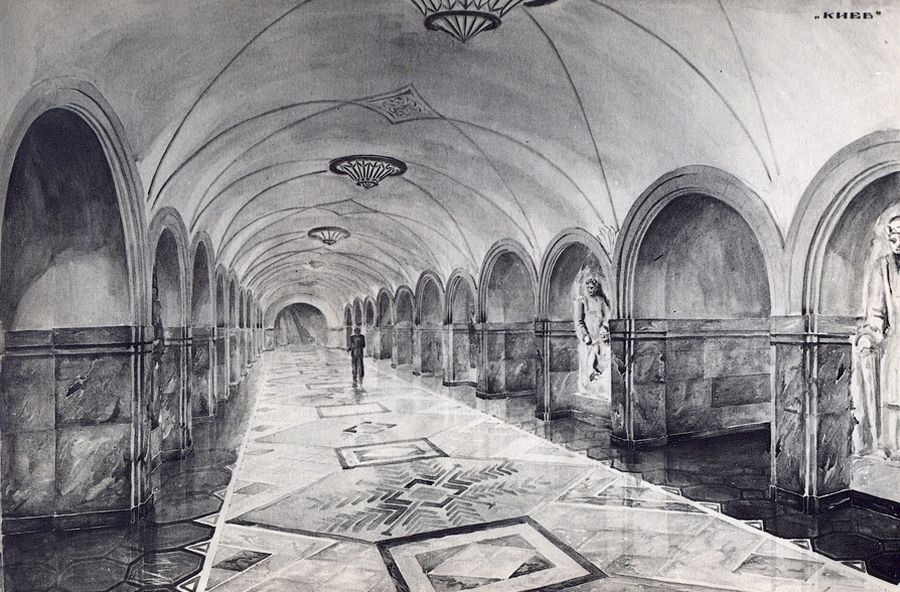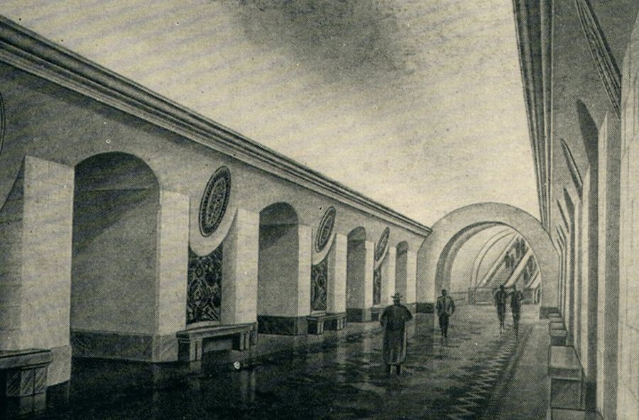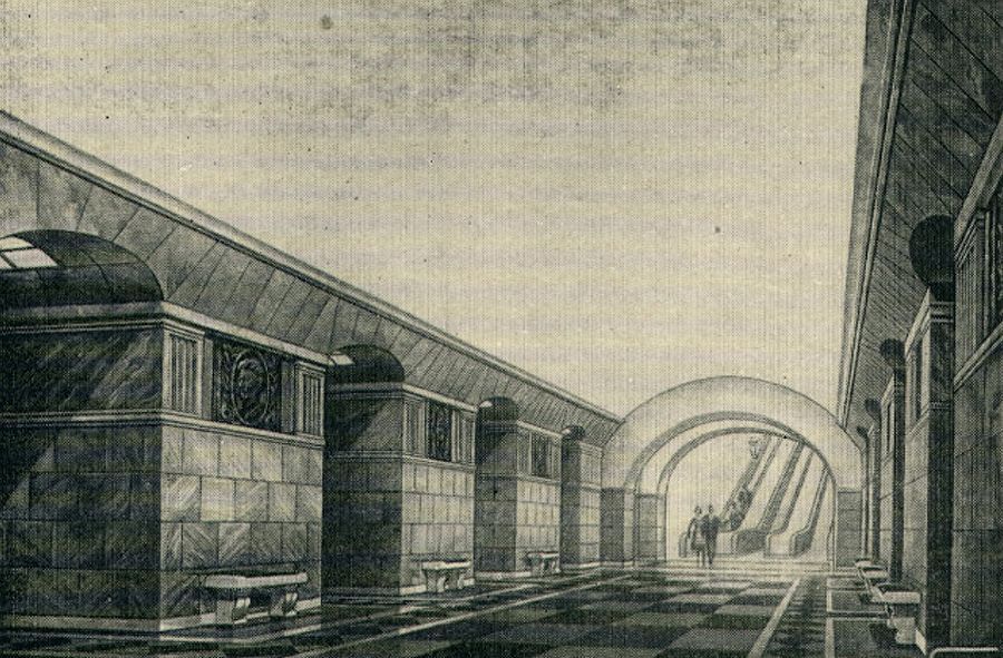 Конкурс на проєкт оформлення станції проводили щонайменше двічі: на початку та наприкінці 1950-х. Ось який вигляд мали більш ранні ескізи 1952 року.