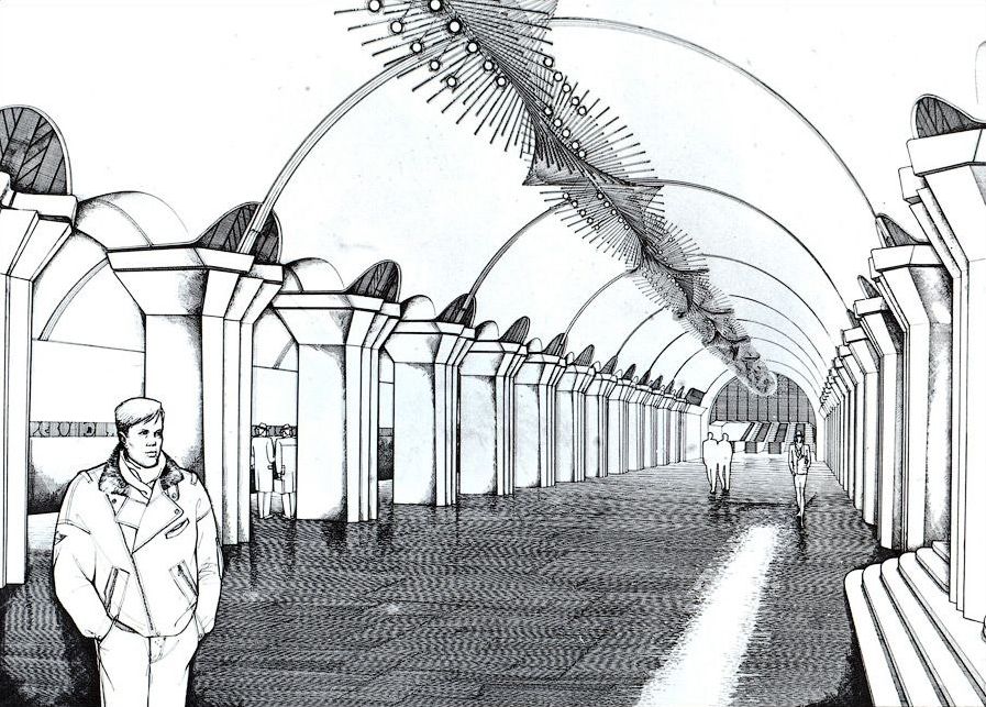 У конструкцію переходу від самого початку заклали понад десяток торгових залів, а також два кафе й театральні каси. Тут навіть планували облаштувати пересадковий вузол метро–тролейбус — тролейбуси мали заїжджати вниз по нахилу та зупинятись перед виходом із переходу. Врешті цю ідею так і не реалізували.