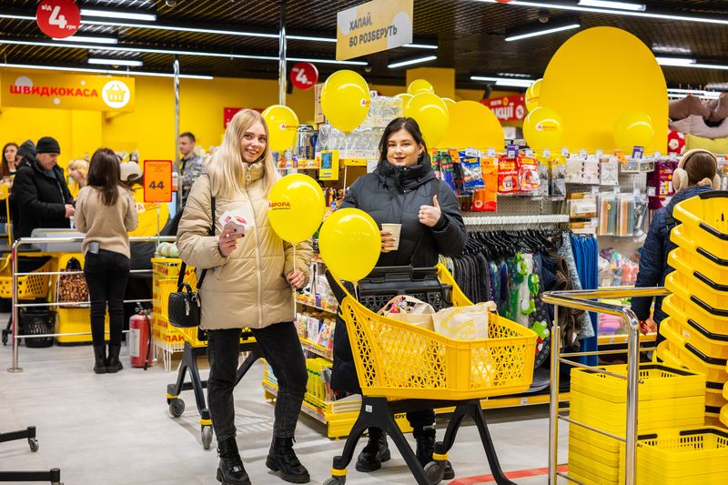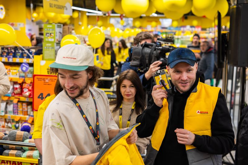 Тим часом стендап-комік Василь Байдак допомагав задонатити на іншій касі. Він підтвердив, що кавуни таки літають цього дня з каси на касу, хоч і іграшкові: "В "Аврорі" періодично літають товари, такий собі товаропад. Але ж це веселить не тільки нас, сподіваюсь. Якщо серйозно, то це абсолютно благодійний день і мене це максимально мотивує. Весь прибуток і вся виручка йде на благодійність. А я вважаю, що благодійність робить бізнес свідомим і от "Аврора" розуміє, що відкриття магазину — це чудова можливість збільшити допомогу ЗСУ. Компанія постійно підтримує різні збори, до речі, і мій збір вони допомогли закрити на мільйони гривень. І я радий бути корисним і допомагати закрити тепер їхній збір своєю роботою на касі".