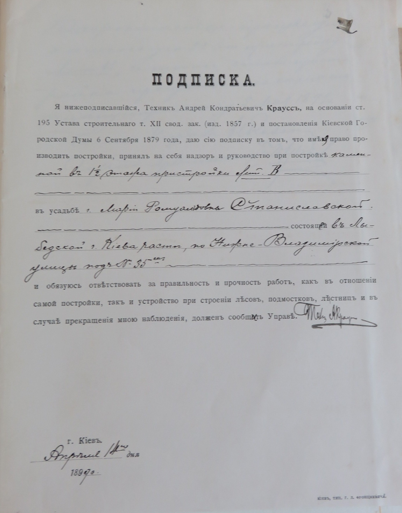 Дякуємо Ігнатію Казимировичу — підпис цілком розбірливий! На відміну від багатьох його колег. А потім з'явився ще один проєкт, який автор підписав власноруч — проєкт особняка на колишній Багговутівській, 14 (нині – вулиця Загорська). І ось уже архітектор-привид почав матеріалізуватися!