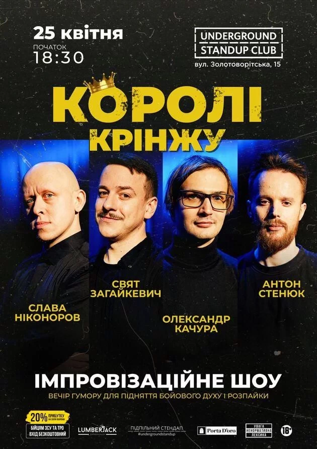 У цьому унікальному комедійно-імпровізаційному дійстві беруть участь Свят Загайкевич, Олександр Качура, Антон Стенюк і В'ячеслав Ніконоров. За словами стендаперів, такий експериментальний формат ти більше не побачиш ніде: буде смішно, незабутньо й неповторно! Для тих, хто любить гарячі жарти.