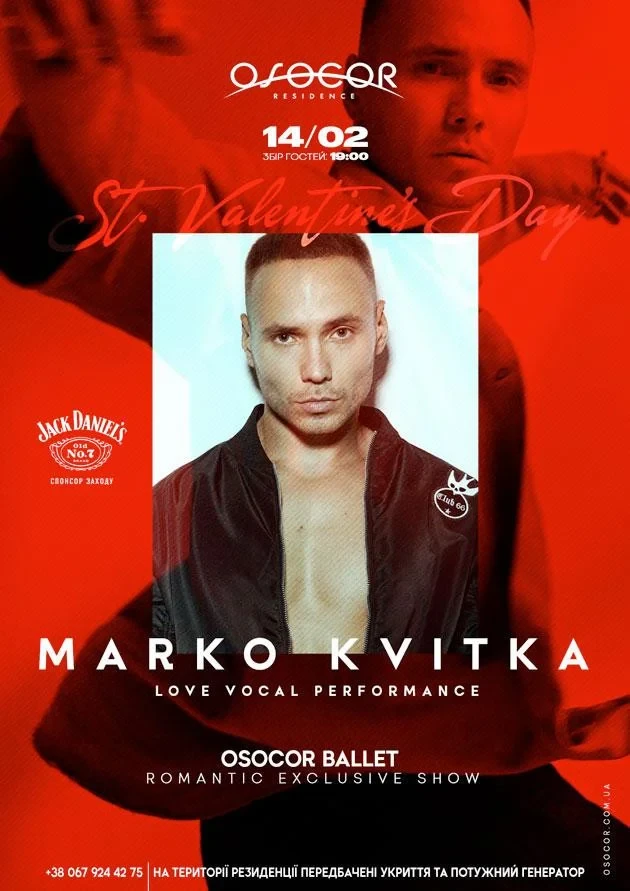 Зірка проєкту "Голос країни" MARKO KVITKA до Дня закоханих представляє шоу LOVE VOCAL PERFORMANCE, в якому його чуттєвий вокал, поєднаний із хореографією OSOCOR BALLET, створить незабутню романтичну атмосферу.