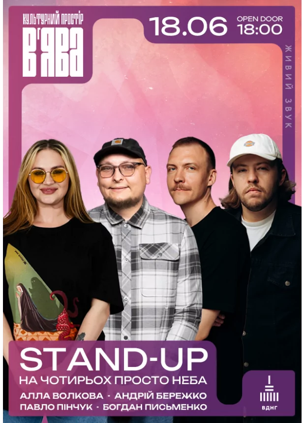 Чотири потужні голоси українського стендапу: Алла Волкова — перша комікеса, яка зібрала Палац спорту, Андрій Бережко — зірка "Рофлів" і "Тік Ток Патруля", Павло Пінчук — майстер точного гумору "з народу" та Богдан Письменко, один із найсміливіших представників сучасного стендапу, — зберуться в одному шоу просто неба у "В'ЯВА".