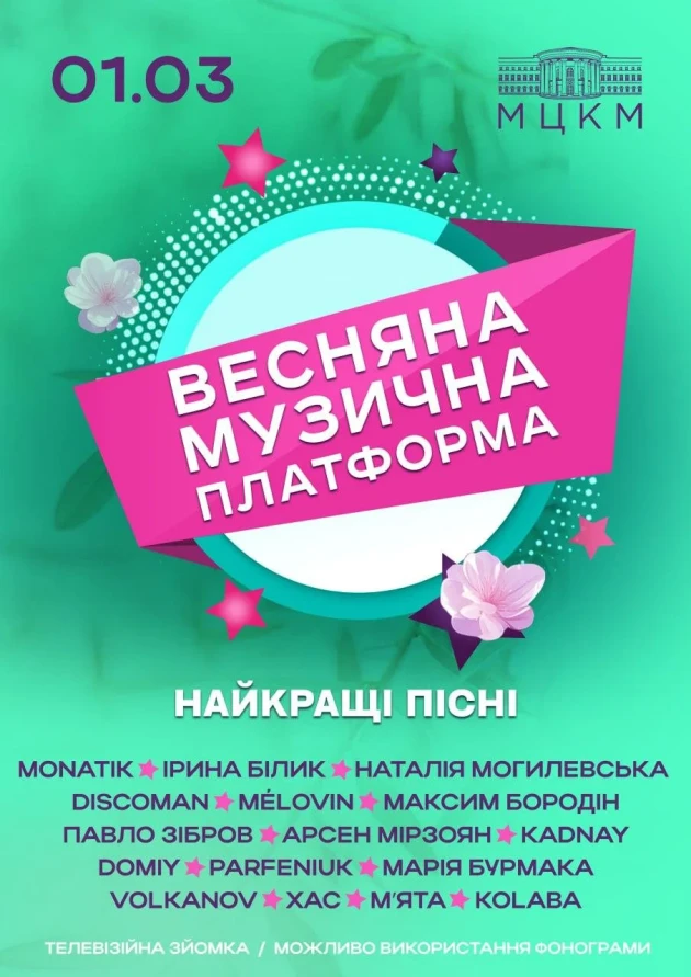 "Музична Платформа" знову запрошує на зустріч із найпопулярнішими артистами України. Цього разу старими й новими хітами тішитимуть Melovin, Monatik, Наталія Могилевська, Ірина Білик, Арсен Мірзоян, гурт KADNAY, PARFENIUK, Максим Бородін, VOLKANOV, Павло Зібров, Domiy, ХАС, DISCOMAN, KOLABA, М'ЯТА та Марія Бурмака.