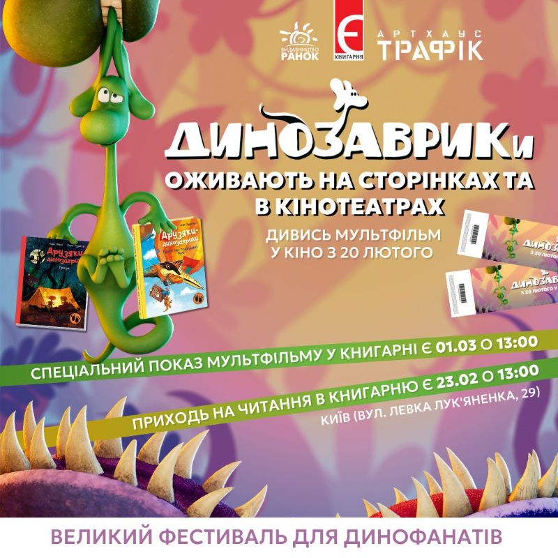На гостей фестивалю чекають читання книги "Друзяки Динозаврики", майстер-класи та інтерактивні ігри, показ мультфільму "Динозаврик", розіграш квитків на мультфільм "Динозаврик" та подарункових боксів.