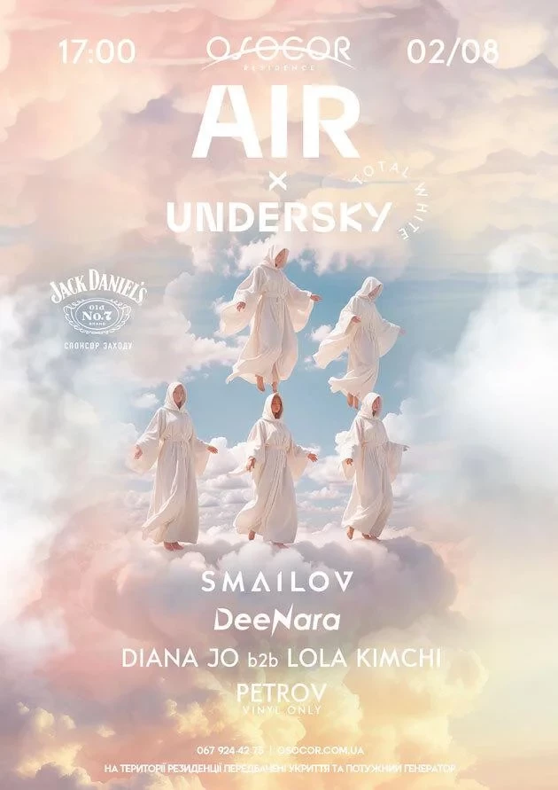 Air x Undersky — літній формат танцювальної електроніки. На тебе чекає естетичний open air у заміському форматі, вечірка-епос із виступами артистів: Smailov, Deenara, Diana Jo B2b Lola Kimchi, Petrov (only vinyl).