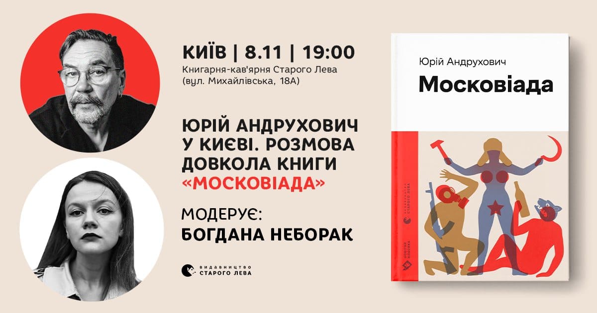 У Книгарні-кав'ярні Старого Лева проведуть зустріч із письменником Юрієм Андруховичем. Розмова буде про постмодерністський роман "Московіада" 1992-го. Цього року твір про один день із життя українського поета в російській столиці вийшов в оновленому виданні. Про віднайдення нових сенсів, зміну реальностей та контекстів, нових читачів і реактуалізацію класики з автором говоритиме журналістка Богдана Неборак.