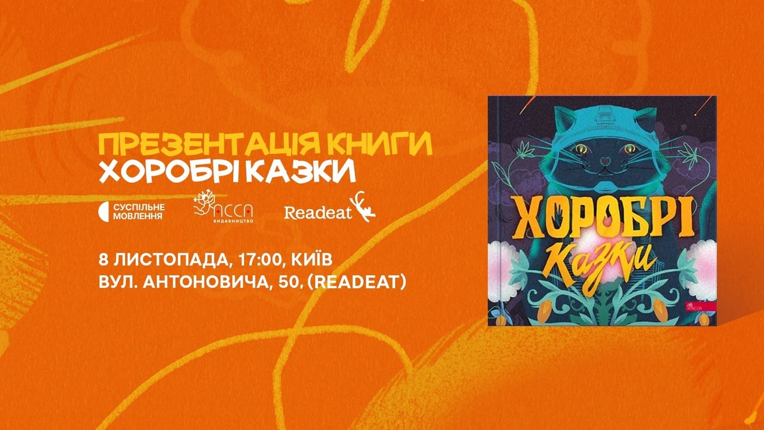 У книгарні Readeat презентують книжку "Хоробрі казки". Містить 12 терапевтичних історій по спільний досвід різних українських родин в умовах війни. В основу казок лягли 12 тем, серед яких — дружба, доброта, підтримка, солідарність, втрата, належність до спільноти, віра у перемогу. Аудіоверсії записали зірки, зокрема Юлія Саніна, Злата Огневич, Ірма Вітовська, Тарас Компаніченко, Павло Вишебаба. Про збірку розкажуть її авторки Вікторія Мурована та Ірина Виговська.