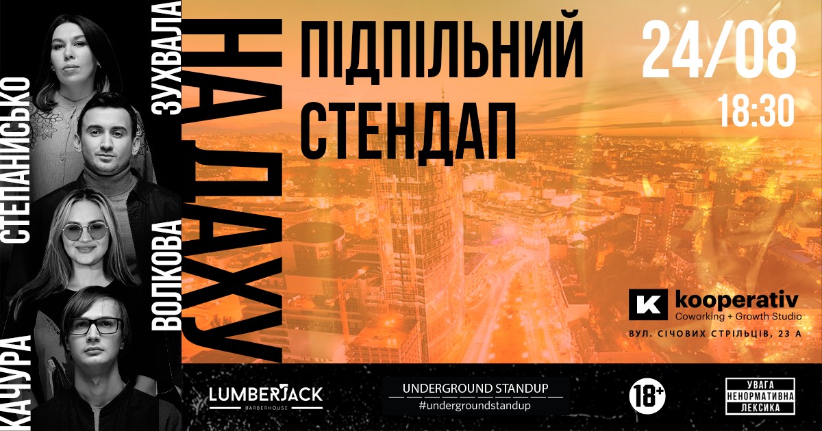 У День Незалежності України на даху "Кооперативу" відбудеться виступ "Підпільного Стендапу". Цього дня там виступатимуть: Настя Зухвала, Сергій Степанисько, Олександр Качура, Алла Волкова. Фірмовий гумор стендаперів та дружня атмосфера гарантовані.