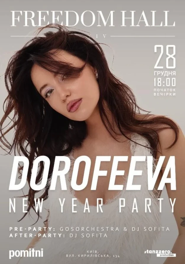 Головною зіркою новорічної вечірки у Freedom Hall буде DOROFEEVA зі своїми найкращими хітами. Та, окрім неї, виступатимуть й інші топові артисти, а симфонічний оркестр GosOrchestra разом із молодою виконавицею Dj Sofita влаштують симфонічний танцювальний сет!