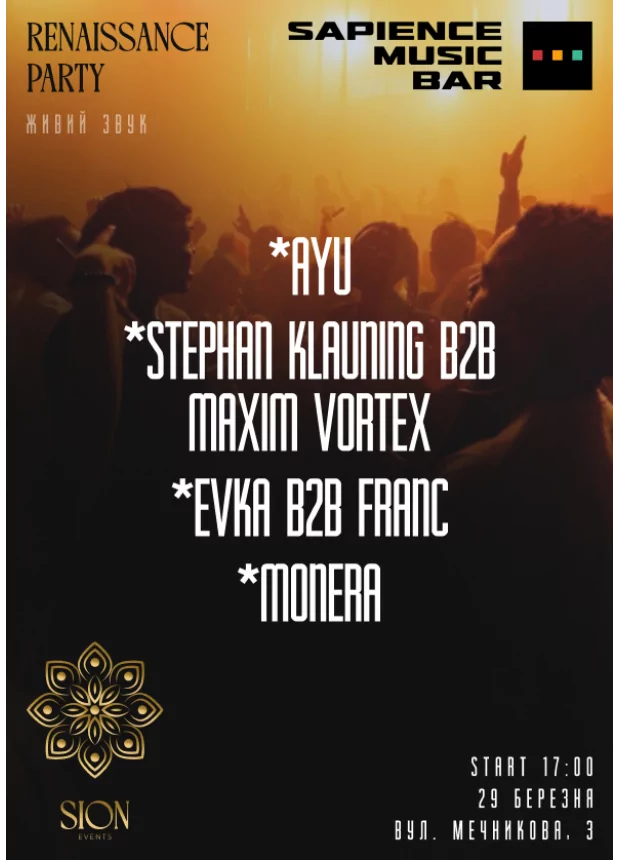 Електронна музика лунатиме у вишуканій атмосфері Sapience Music Bar. LINE-UP: AYU (Львів), Maxim Vortex, Stephan Klauning B2b, Evka B2b Franc, MONERA.