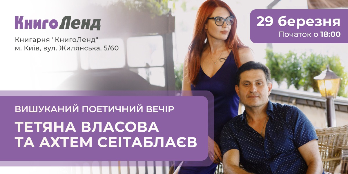 Цього вечора у книгарні "КнигоЛенд" відомий український актор та режисер Ахтем Сеітаблаєв і поетеса Тетяна Власова читатимуть поезію, створюючи неймовірну атмосферу близькості, натхнення, любові й краси. У виконанні Тетяни та Ахтема глядачі почують віршовані історії про життя, любов, підтримку і віру під час війни.